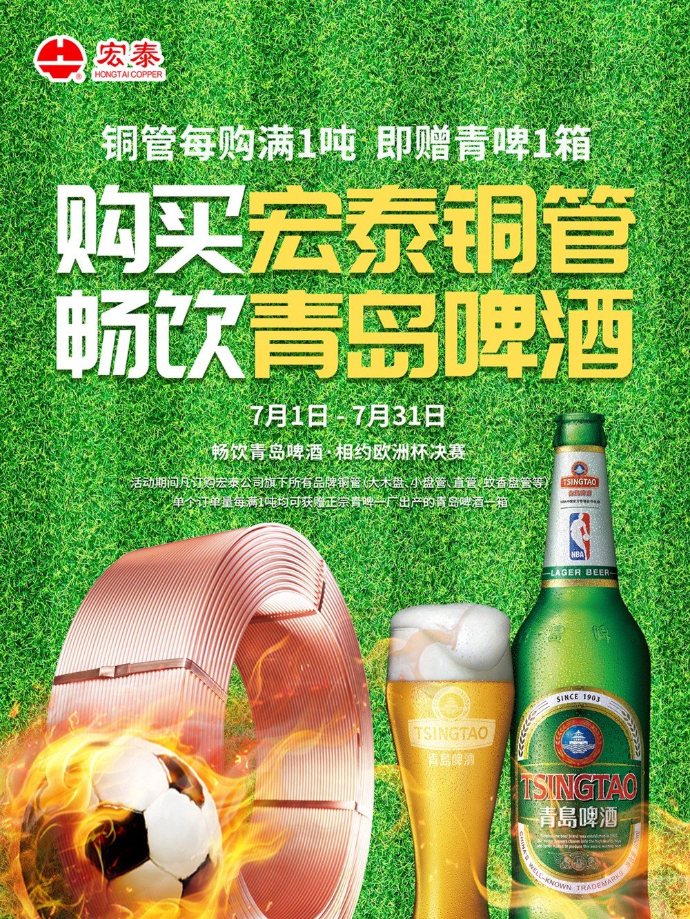 7月1日至7月31日期間,凡訂購宏泰公司旗下所有品牌銅管(大木盤、小盤管、直管、蚊香盤管等)的客戶,單個訂單量每滿1噸,即可獲贈青啤一廠生產的青島啤酒一箱!